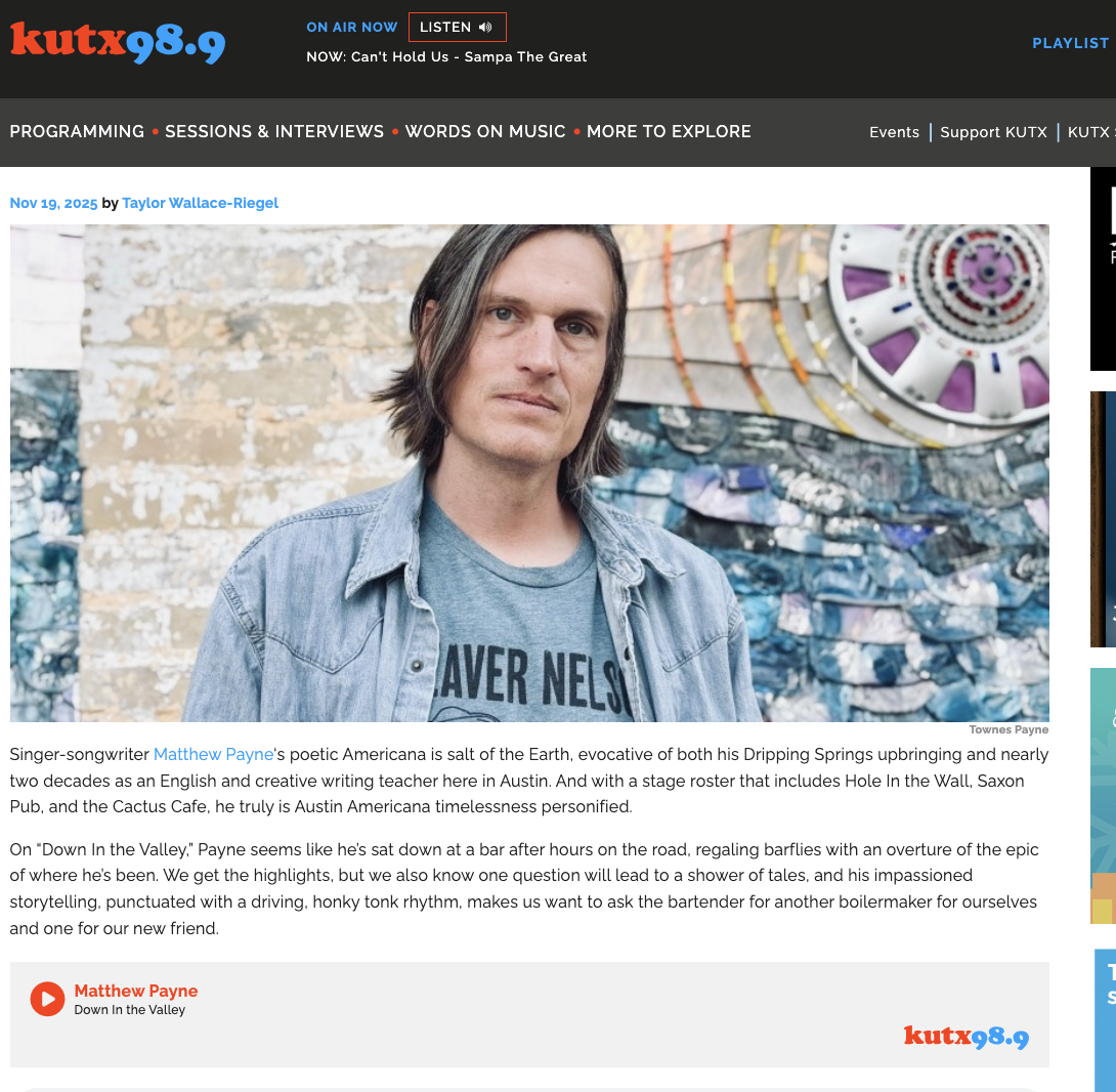 Matthew Payne is a songwriter from just outside of Austin, raised in the Hill Country, and his music really reflects that—earthy, poetic, and rooted in place. He’s got that classic Texas Americana sound, but what makes him stand out is the way his lyrics paint a picture—of the land, the people, and the quiet in-between moments.